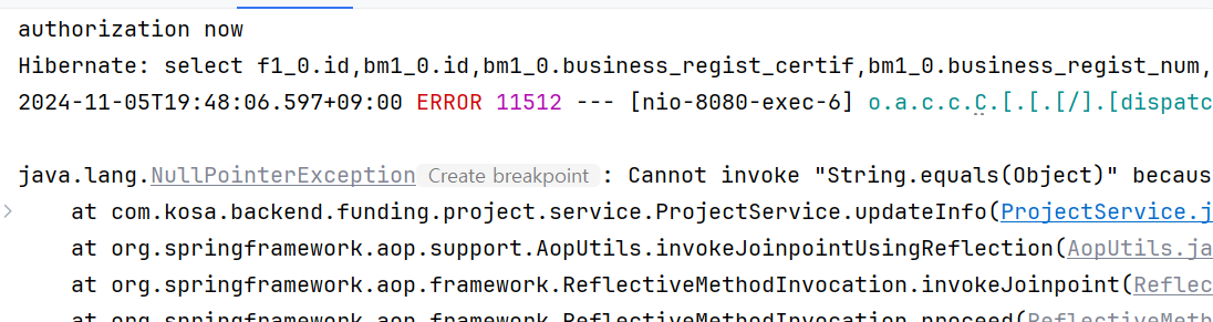 실제로 NullPointerException 에러가 발생하는 것을 확인할 수 있다.