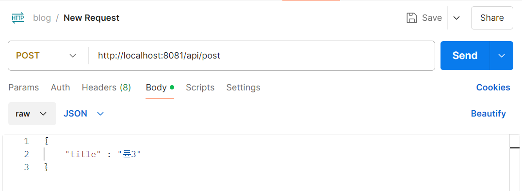 값을 title, author에서 author를 누락하고 보내면 스브링 부트에서는 해당 필드 null 값으로 처리한다.