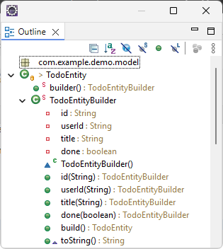 실제 Outline을 살펴보면 내부적으로 builder( ) static 메소드와 TodoEntityBuilder static 클래스가 생성된 것을 볼 수 있다. 앞에 빨간색 글씨로 S가 붙여져 있으면 static 정적을 나타낸다.