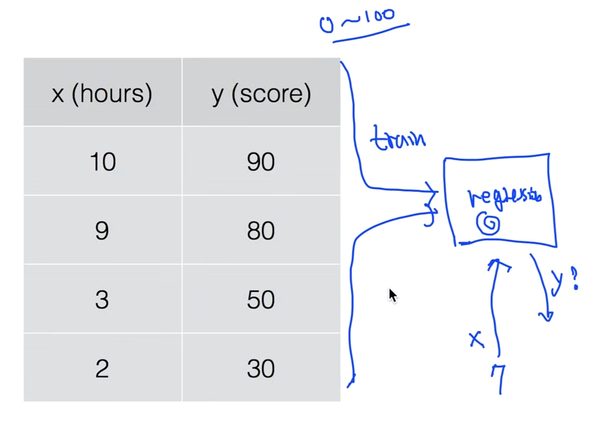 위와 같은 시간에 따른 점수에 따른 데이터를 갖고 학습시킨다. 이런 regression 모델이 데이터를 갖고 학습하면 어떠한 모델이 만들어진다.