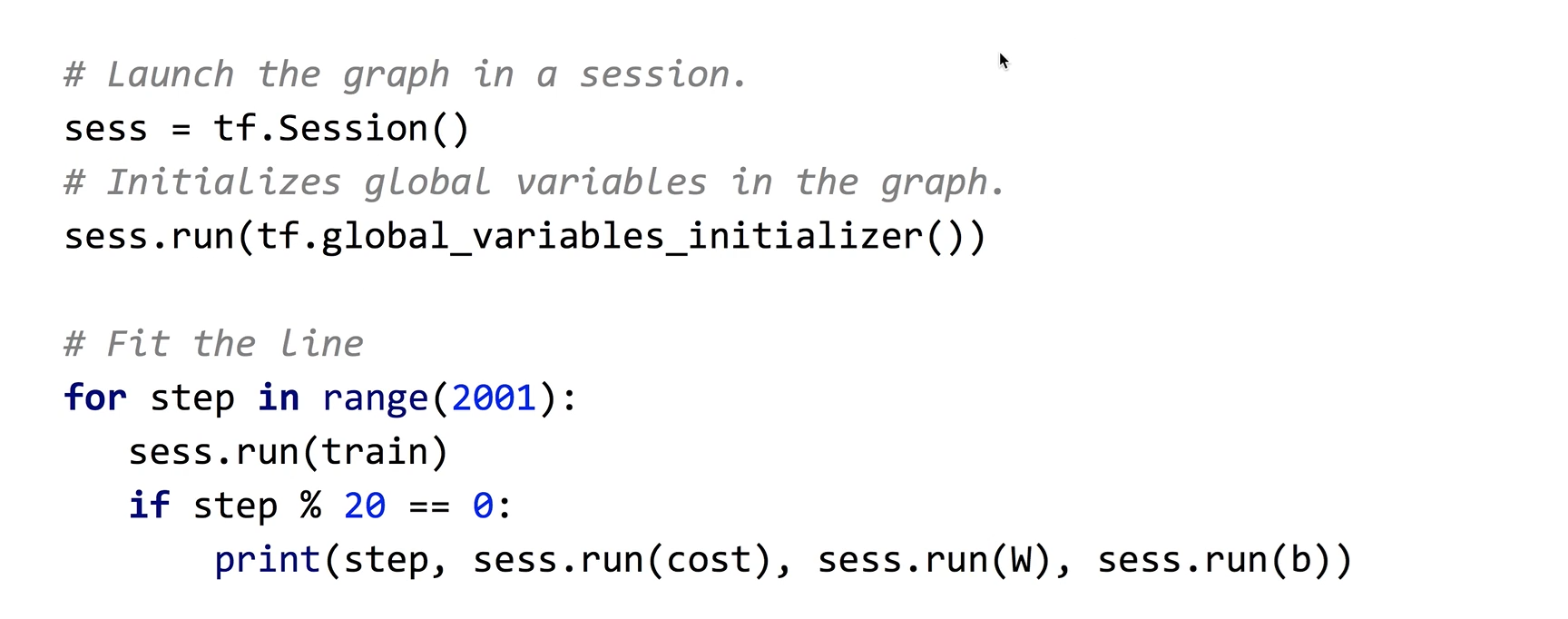 - sess.run(tf.global_variables_initializer())는 W, b를 초기화 하는 과정이다.