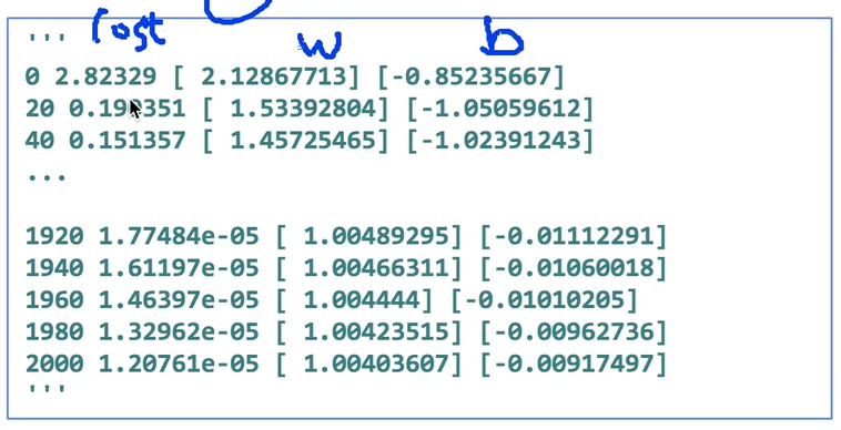 - train된 값을 print하는데 2000번 출력하기 쉽지 않으므로 20번에 한 번 꼴로 const, W, b를 출력한다.