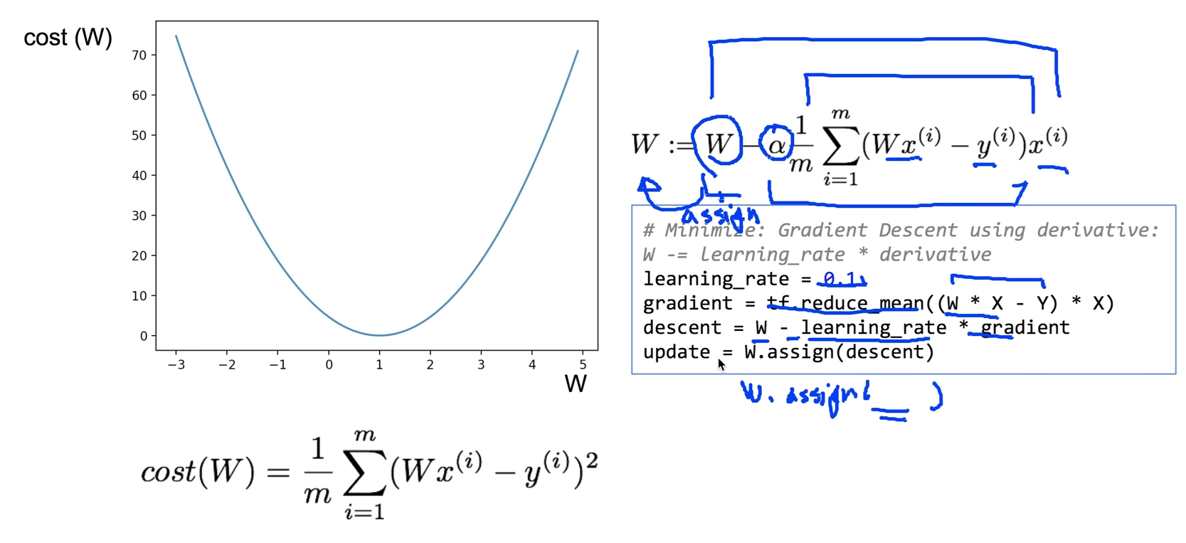 3. update = W.assign(descent) -> 계산된 descent 값을 W에 **덮어쓰기(assign)**하는 연산 객체 update를 그리면 된다.