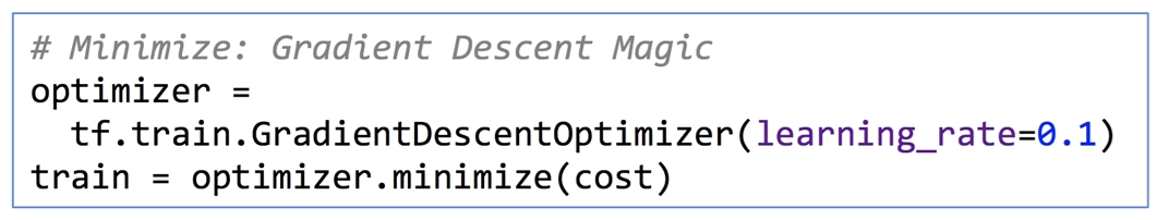 위와 같이 미분값이 쉬울 때는 직접 대입할 수 있지만 tensorflow에서 GradientDescentOptimizer를 제공하고 optimizer에 minimize 메소드를 통해 cost가 최소가 되게 구할 수 있다.