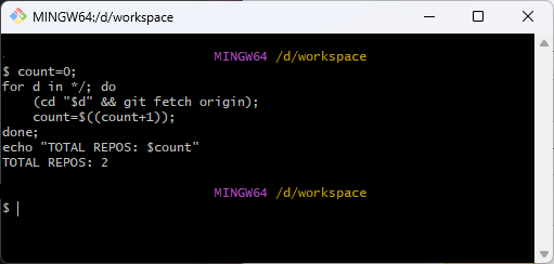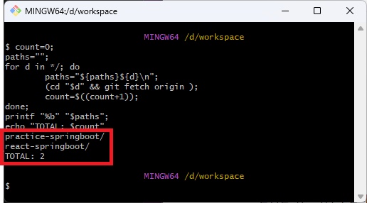 위와 같이 입력하면 위에서 정의한 함수가 실행되며, 해당 하위 디렉토리에 있는 Git 저장소가 있는 프로젝트에 git fetch가 일괄적으로 실행된다.