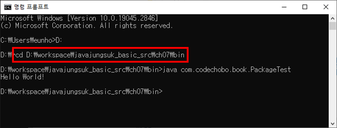 커맨드를 열어서 실행할 수 있다. "cd D:\workspace\javajungsuk_basic_src\ch07\bin"로 경로를 바꿔야 한다. 이 때, src 폴더와 bin 폴더를 구분하자. 실행할 파일은 *.class 파일이지 *.java가 아니다. 따라서 bin 폴더로 경로를 바꿔야 한다.