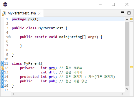 private는 같은 클래스에서만 사용할 수 있어 오류가 발생하고, default는 같은 패키지에서만 사용할 수 있어 오류가 발생한다. protected는 같은 패키지 + 다른 패키지의 자손 까지 가능하므로 pkg2의 MyChild에서 사용할 수 있다.
