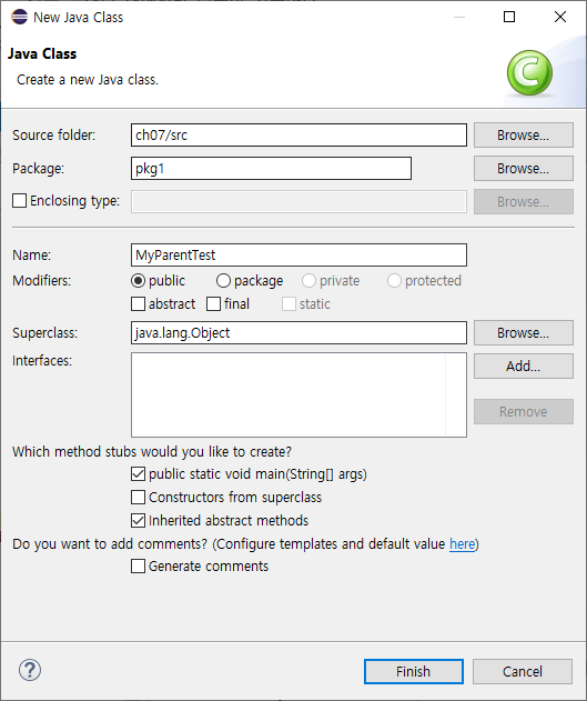 package 이름은 pkg1, class 이름은 MyParentTest로 생성한다.
