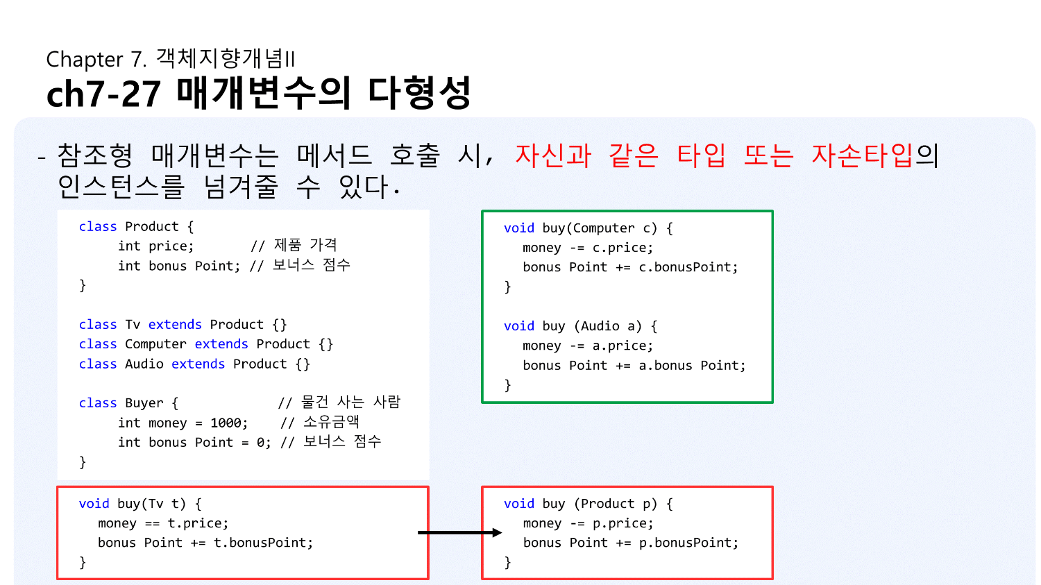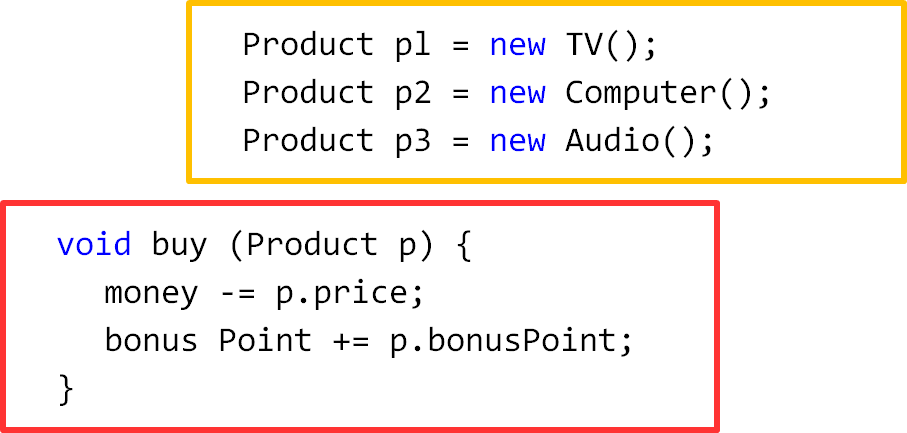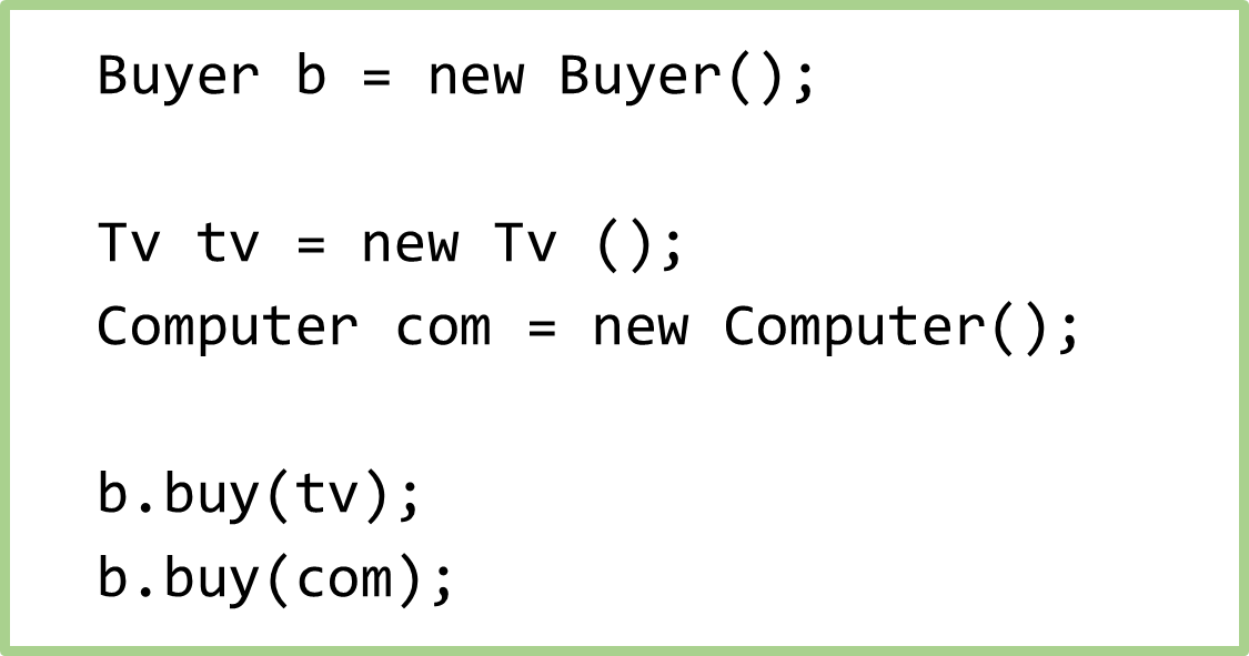 Buyer 클래스 buy 메서드의 참조 변수 타입을 조상인 Product를 사용해서 b.buy(new Tv1()); b.buy(new Computer()); 가 가능하다.