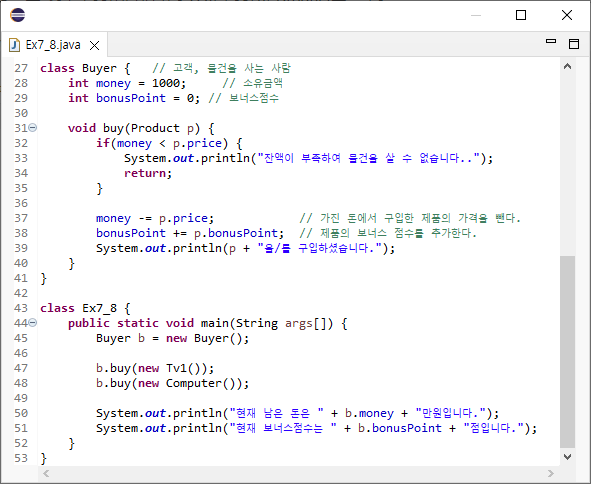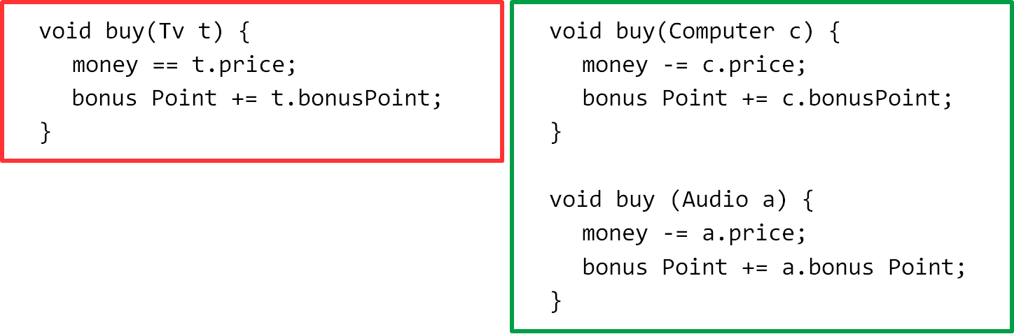 바꾼 메서드로 b.buy(tv); b.buy(com); 둘 다 사용할 수 있다.