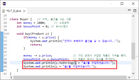 System.out.println(p + "을/를 구입하셨습니다.");와 System.out.println(p.toSring() + "을/를 구입하셨습니다.");은 같은 문장이다. 참조변수와 문자열을 결합할 때는 toString을 호출해서 결합한다.
