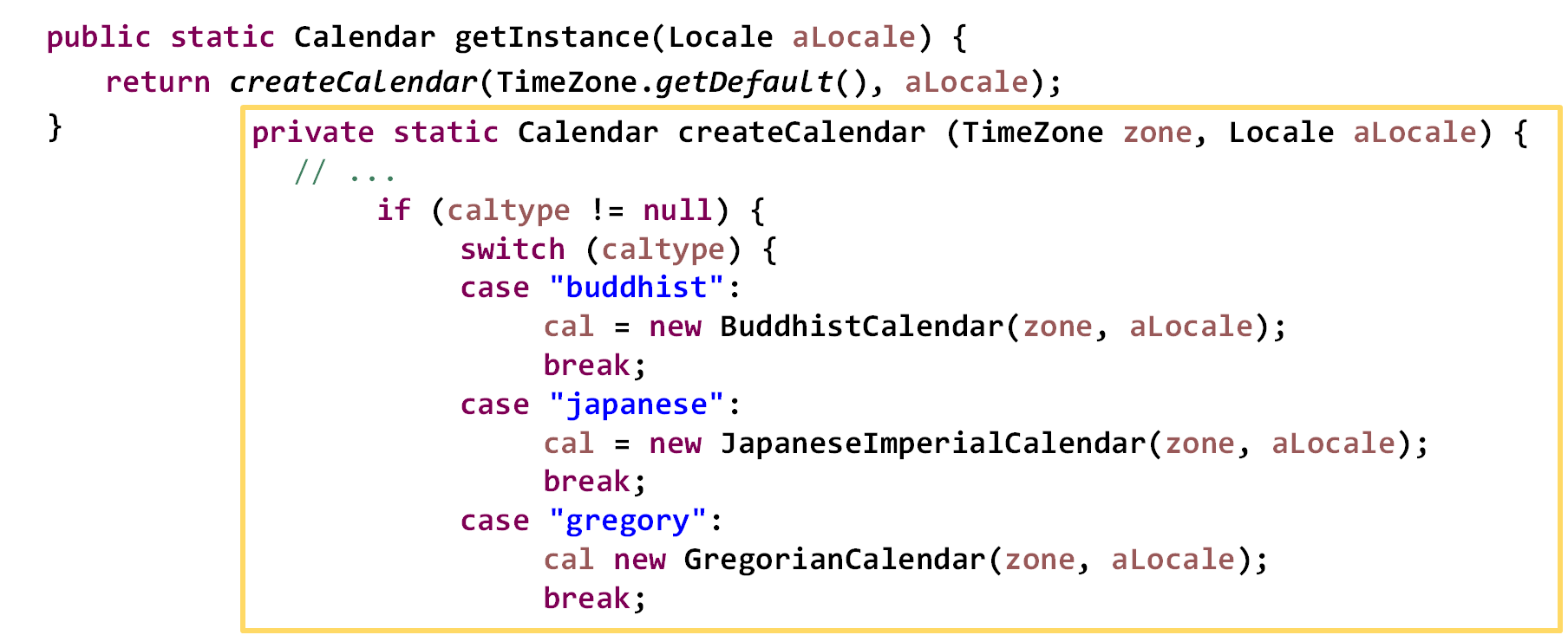 getInstance()가 추상적이기 때문에 위와 같이 createCalendar 메서드를 만들어서 caltype에 따라 다른 객체를 생성해서 반환할 수 있다. 구체적으로 적으면 cal 사용한 곳을 전부 바꿔야 한다. 추상적으로 적으면 getInstance()에 들어있는 메서드인 createCalendar만 바꾸면 되므로 변경에 용이하다.
