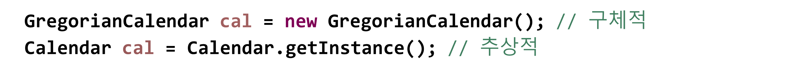GregorianCalendar 클래스는 Calendar 클래스를 상속받는 자손 클래스이다. 참조 변수의 타입과 객체의 타입이 일치하면 구체적이다. 하지만 Calendar 클래스는 추상 클래스이기 때문에 객체생성이 불가능하고, Calendar.getInstance() 메소드를 사용해야 한다. 다형성으로 Calendar 조상 타입의 참조 변수에 Calendar의 자손 객체 getInstance()를 반환할 수 있는데 이 인스턴스가 무엇을 반환할지 불분명하다.