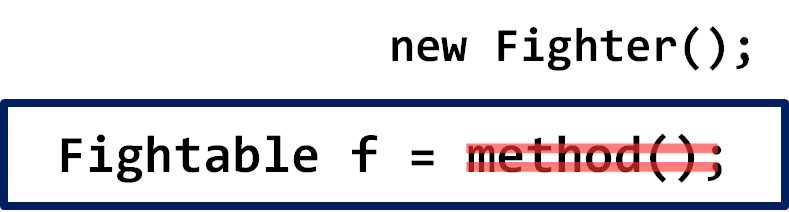 Fightable을 Fighter가 구현했으므로 return에 new Fighter( ); 가 들어가야 한다. 정확히는 f가 Fightable 타입이 아니지만 다형성으로 리턴타입 Fightable로 Fighter 객체 생성해서 담을 수 있다.