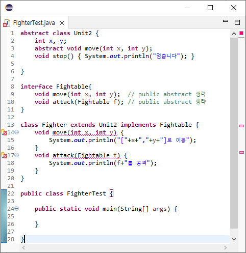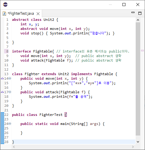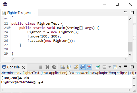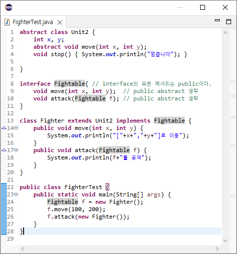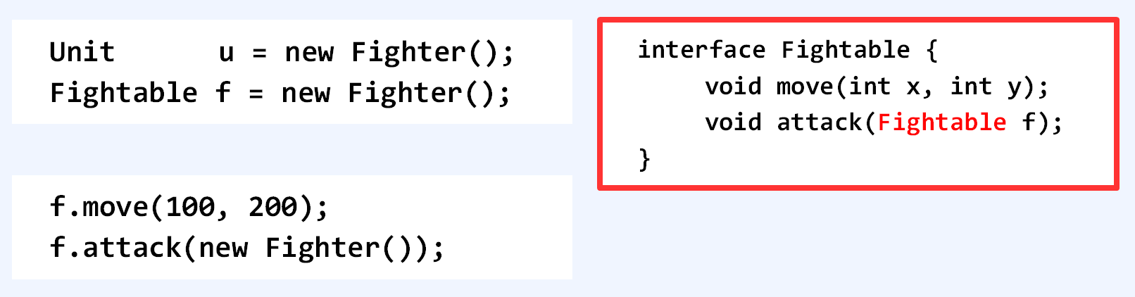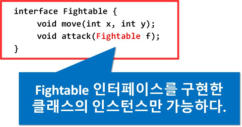 인터페이스 타입 매개변수는 인터페이스를 구현한 클래스의 객체만 가능하다. attack 메서드는 매개변수로 Fightable을 구현한 클래스의 객체만 받을 수 있다는 말이다. 인터페이스를 구현한 놈만 들어오라는 뜻이다.