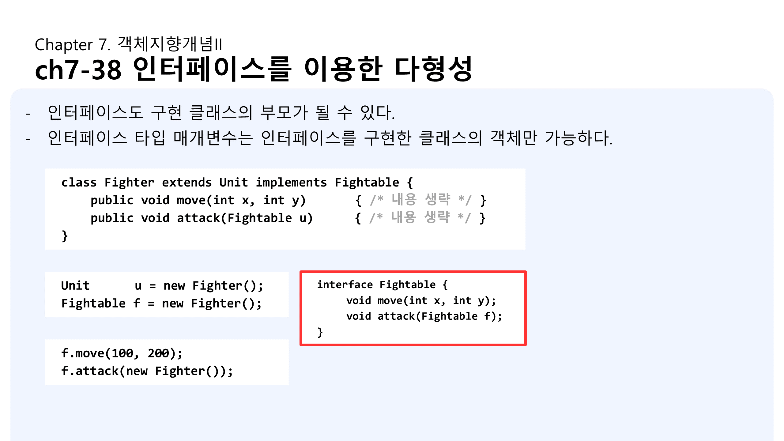 다형성으로 조상 클래스인 Unit 참조 변수로 자손인 Fighter를 생성할 수 있다. 인터페이스도 Fightable 참조 변수로 Fighter를 생성할 수 있다. 대신 Fightable에 정의된 멤버 2개만 사용할 수 있다.