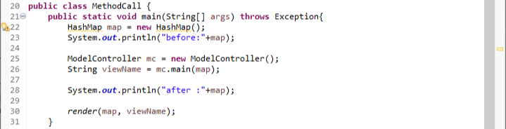 ModelController의 HashMap인 map을 main 메서드에 반환할 필요가 없다. 처음부터 main에서 HashMap을 만들어 넘겨준 것이므로 viewName만 반환하면 된다.