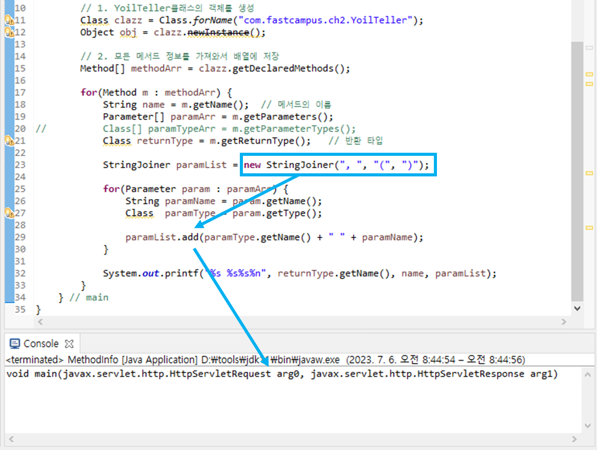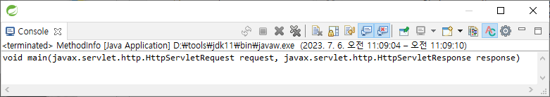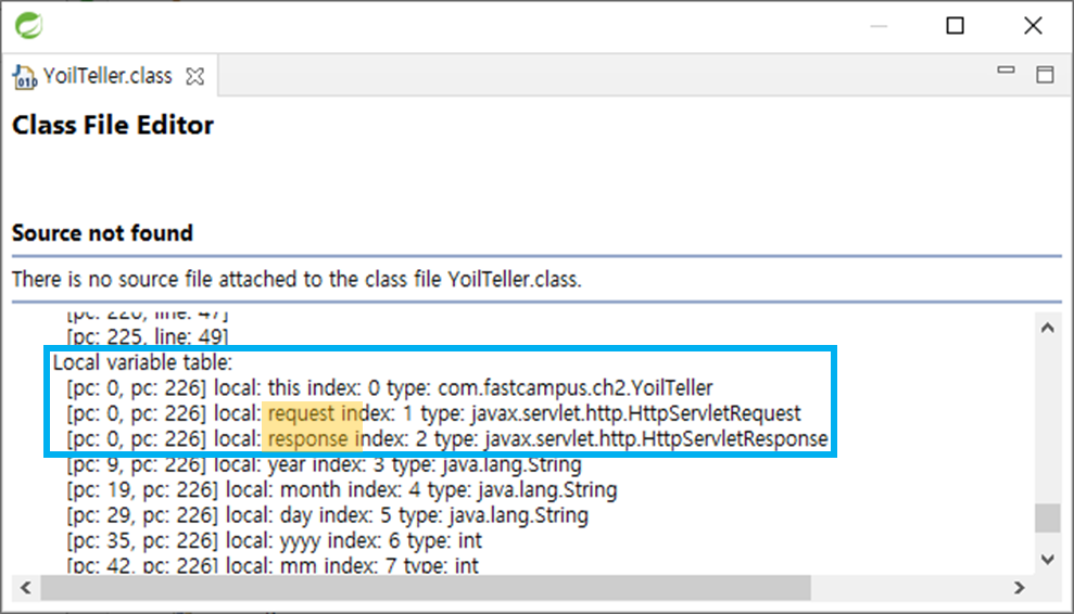 YoilTeller의 매개 변수는 request, response인데 console에 출력된 것의 매개 변수는 arg0, arg1이다. 컴파일러에게 매개 변수의 type은 중요하지만 이름은 중요하지 않다. 컴파일 된 상태에는 매개 변수의 이름은 저장하지 않는다. 매개 변수의 이름을 저장하기 위해서는 컴파일 할 때, javac -parameters 라는 옵션을 추가해야한다. (JDK 1.8에서 추가된 옵션)