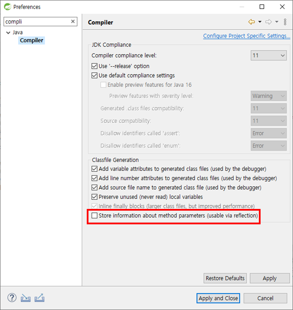 preference에서 compiler의 항목에 옵션을 선택하면 매개 변수의 이름을 저장할 수 있다. 만약 활성화가 안되어있다면 Compiler가 1.8보다 높은 버전으로 설정해야 한다.