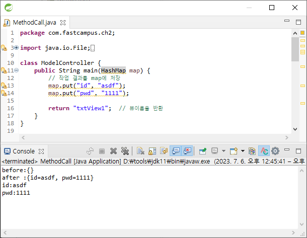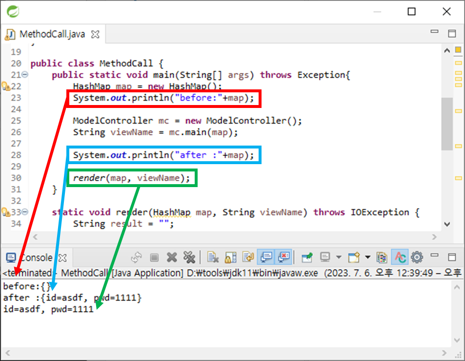 HashMap을 처음 생성했을 때는 data가 없기 때문에 공백이 나오게 되고 ModelController 메서드에서 map에 data가 채워진다. 그리고 retrun에 view가 반환되어 render 메서드로 console에 id, pwd가 출력된다.