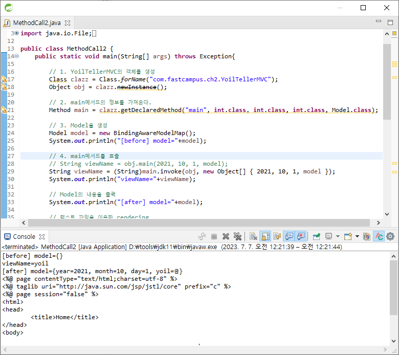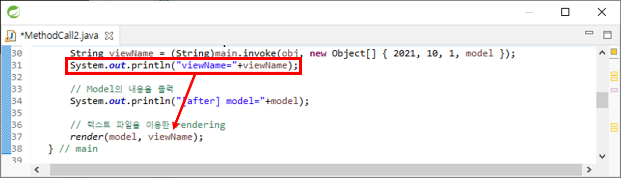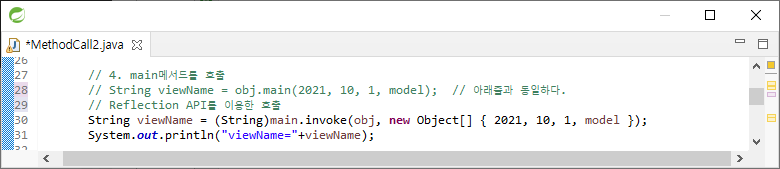 String viewName = (String)main.invoke(obj, new Object[] { 2021, 10, 1, model });는 invoke에서 obj라는 객체에 main 메서드를 호출한다. Object[] { 2021, 10, 1, model } -> Object 배열은 매개변수 2021, 10, 1, model의 개수가 달라질 수 있기 때문에 배열로 받아야 한다. 따라서 객체 배열을 생성하고 값을 줘야한다.