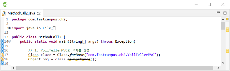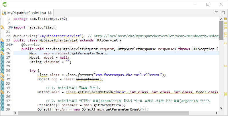 Class.forName을 사용해서 "com.fastcampus.ch2.YoilTellerMVC"의 객체를 생성한다.