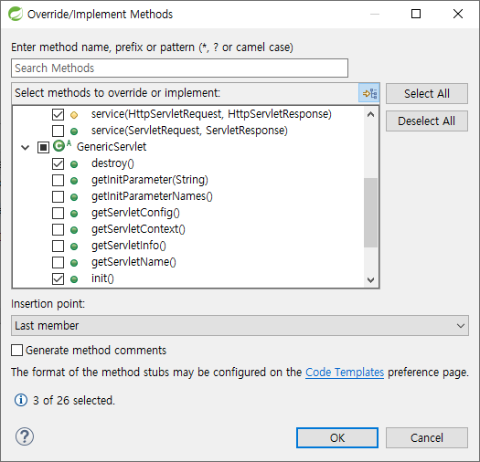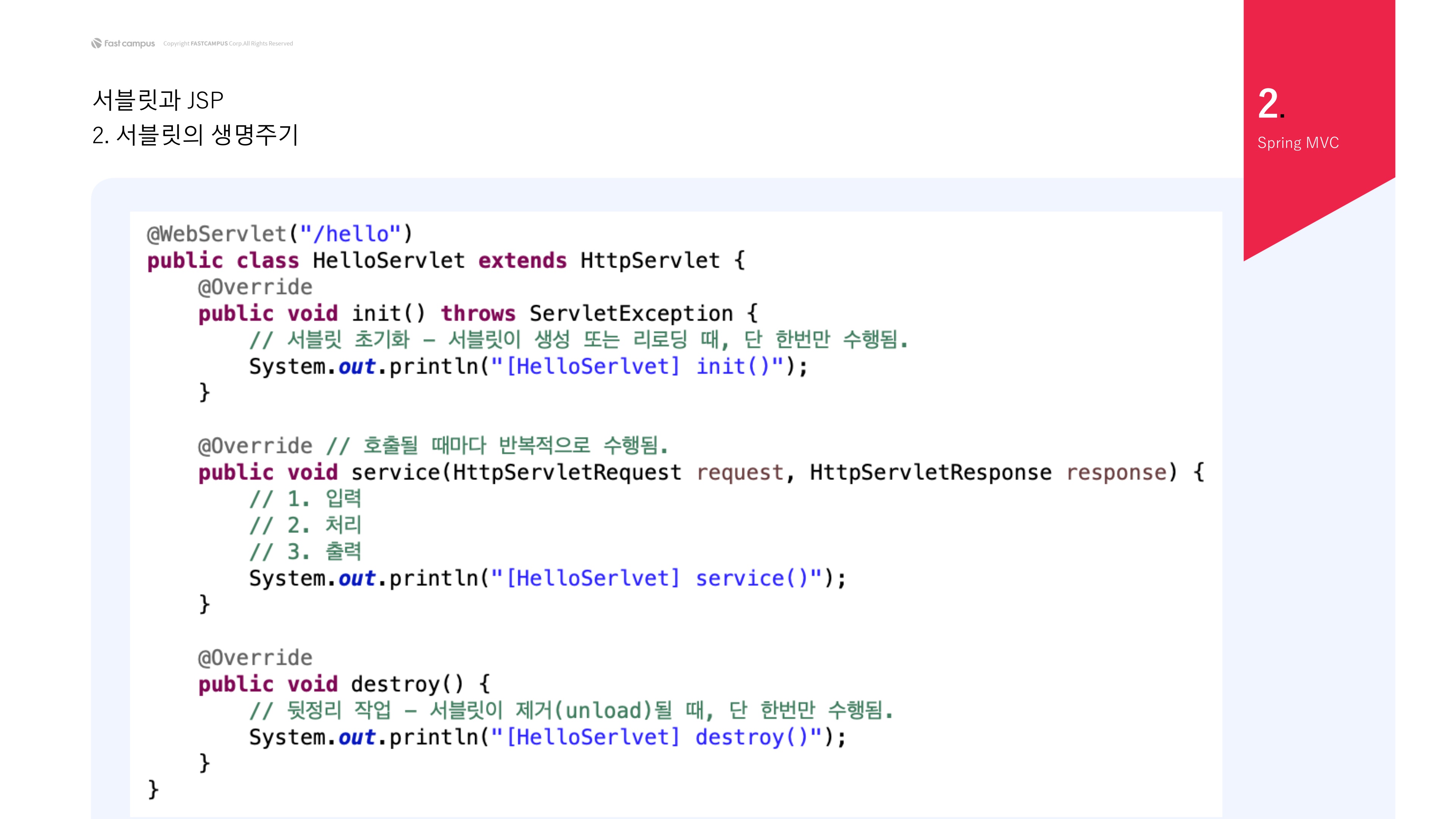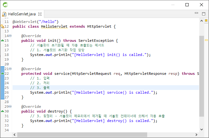 servlet은 기본적으로 3개의 메서드를 갖고 있다. init 메서드는 servlet이 생성될 때 한번만 수행되며 servlet을 초기화한다. 실제 작업을 처리하는 메서드가 service이다. destroy는 servlet이 메모리에서 제거될 때 호출되는 메서드이다. 세 개의 메서드는 우리가 호출하지 않고 servlet container가 자동으로 생성해준다.