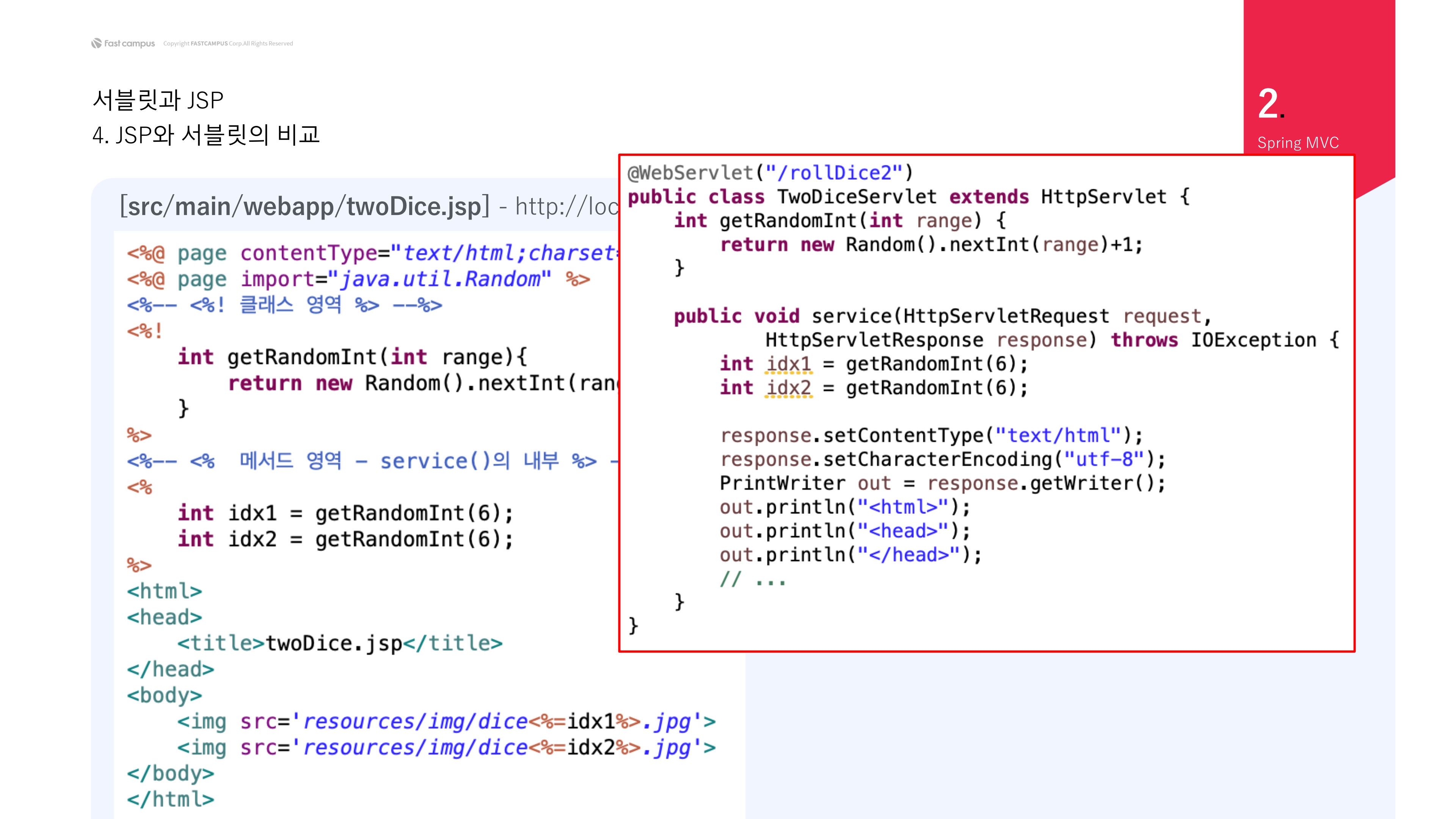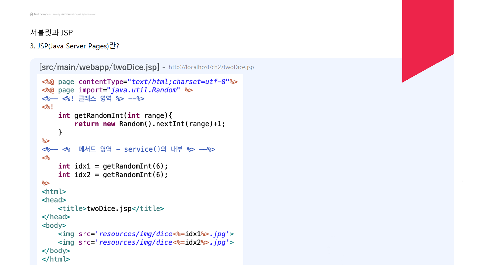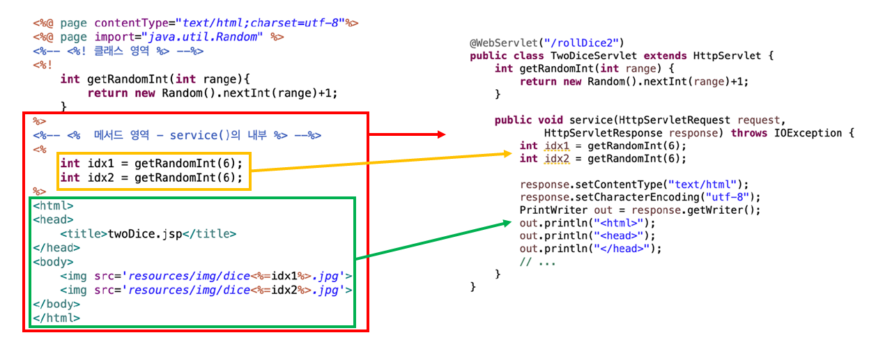 twoDice.jsp 페이지가 오른쪽과 같이 변환된다. JSP는 HTML안에 Java 코드가 있다. 자바코드가 들어가기 위해서는 <%~%> 형식으로 들어가야 한다. 값출력은 <%=값%> 형식으로 들어가고 <%=idx%> -> 3으로 치환된다. HTML의 tag는 out.println으로 자동으로 바뀐다.