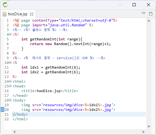 twoDice.jsp가 twoDice_jps.java(servlet파일)로 변환된다. 클래스의 이름도 twoDice_jsp이다.