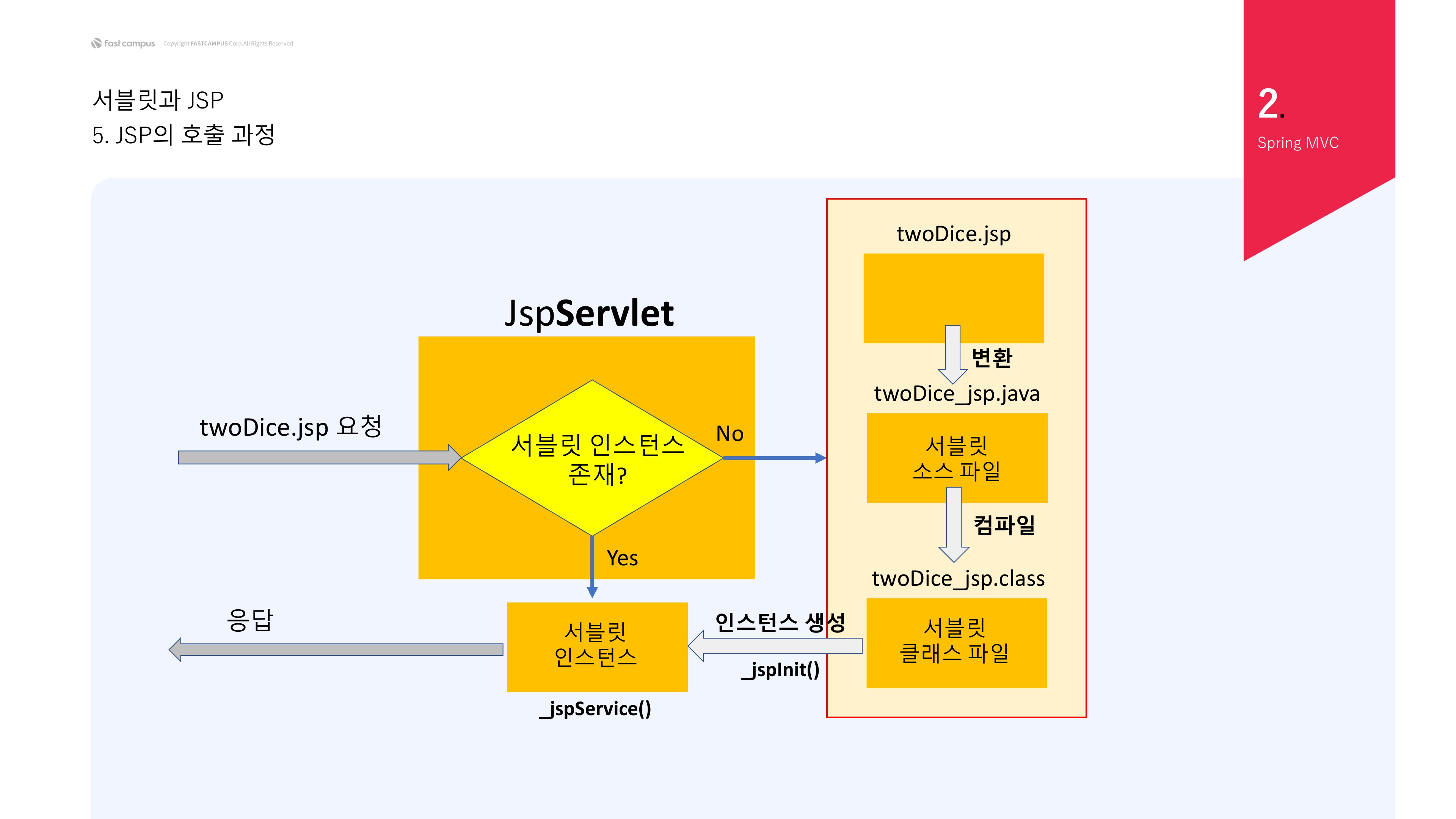 *.jsp파일 요청이 들어오면 JspServlet이 무조건 받는다. JspServlet이 서블릿 인스턴스 존재하는지 확인한다. 서블릿 인스턴스가 없다면 twoDice.jsp를 servlet으로 변환한다. 변환하면 twoDice_jsp.java파일이 생성된다. twoDice_jsp.java파일이 servlet 소스 파일이 되고, 컴파일 되어 twoDice_jsp.class파일이 생성된다.