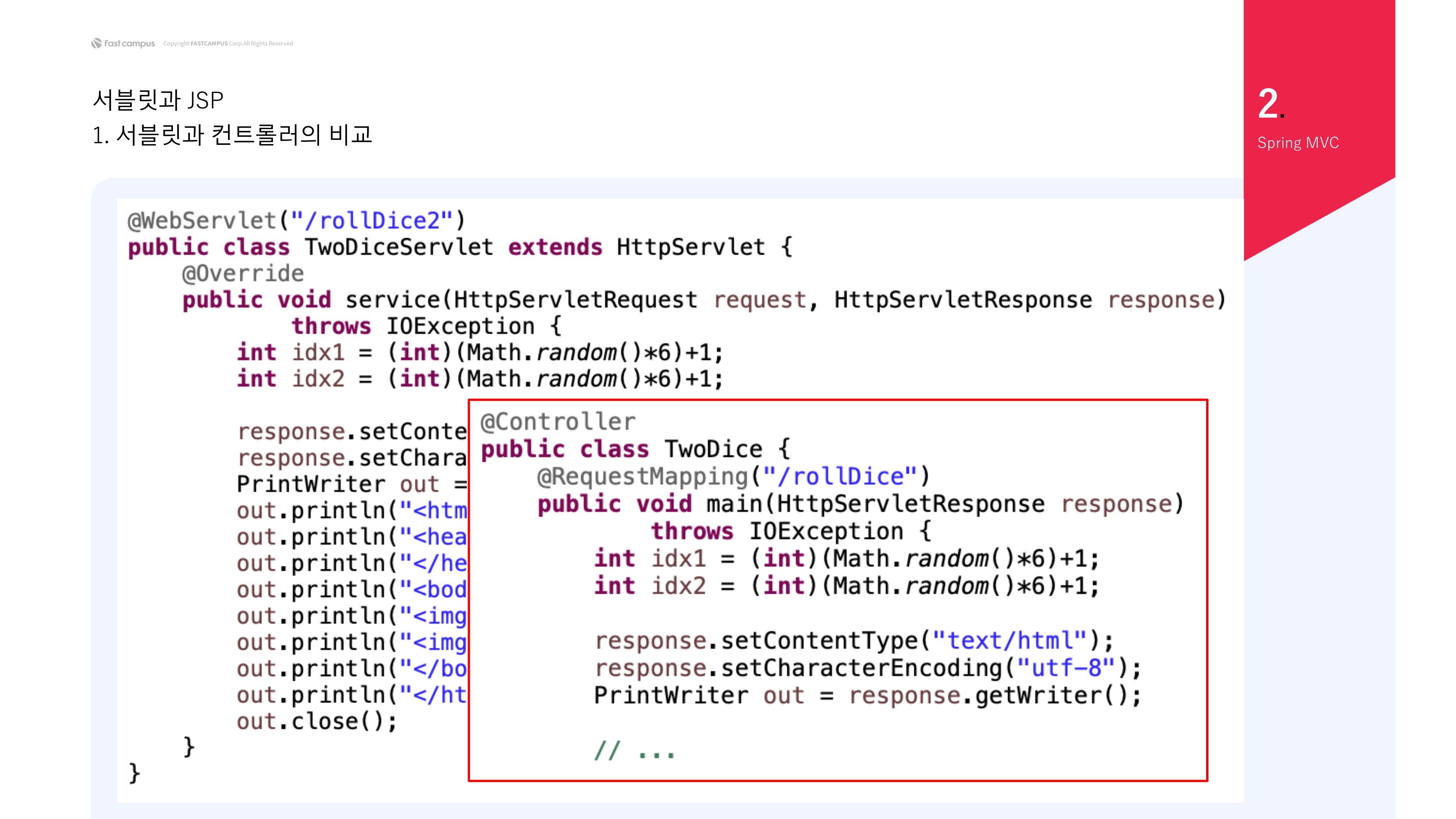 2. @WebServlet = @Controller + @RequestMapping 이다. servlet에서는 @WebServlet에 mapping할 URL을 적는다.