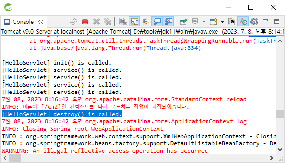 Hello 서블릿 파일을 수정 할 때 reload되면서 destroy 메서드가 자동으로 실행된다. 기존의 HelloServlet을 메모리에서 내리고 다시 톰캣이 기동된다.