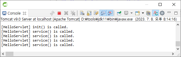 실행한 후에 반복해서 호출 하면 init 메서드는 1번만 실행되고 service가 반복되어 실행된다.