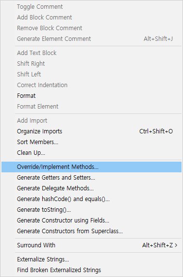 Source - Override/implement Methods로 자동 오버라이드 한다.