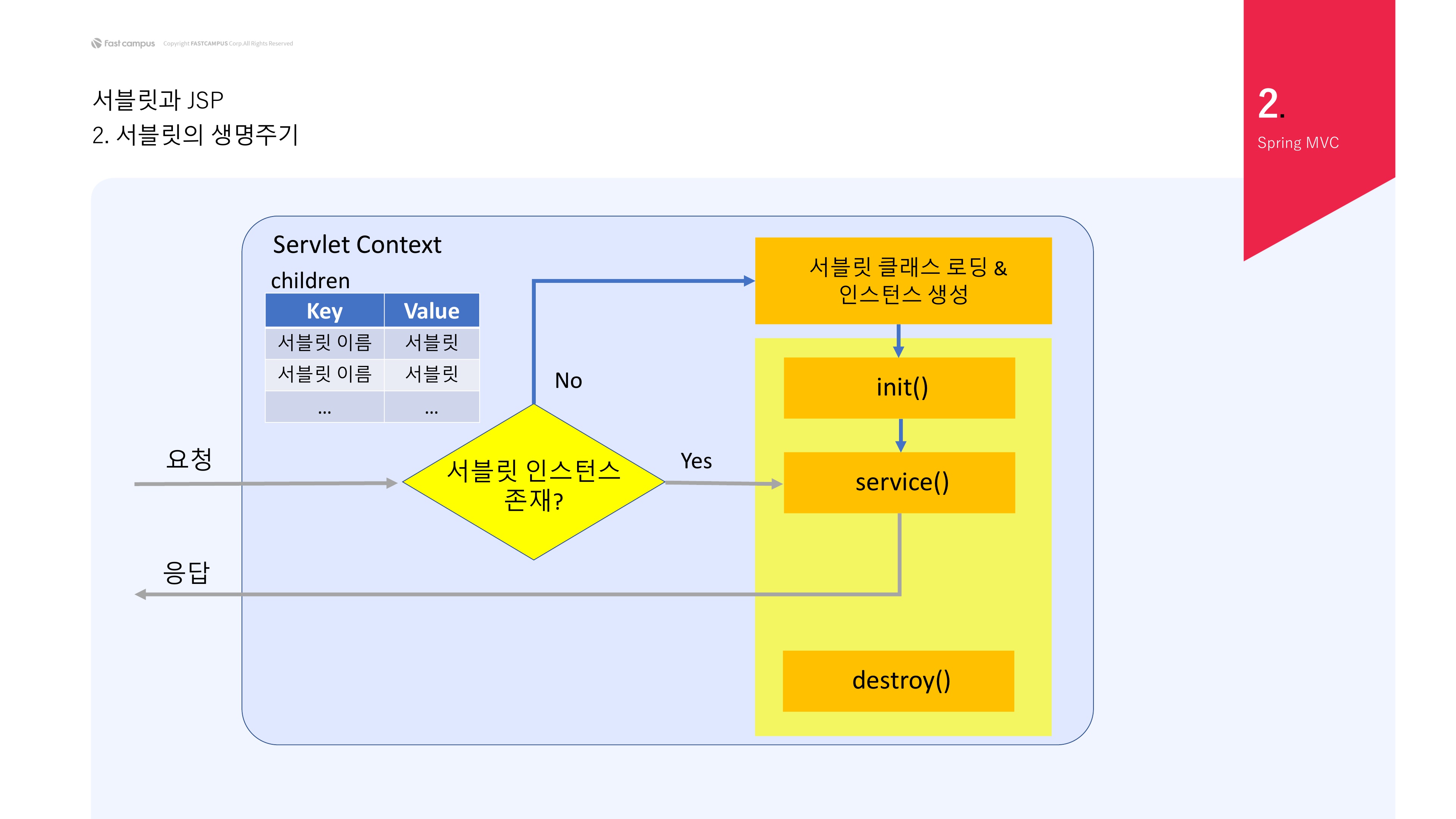 서블릿 객체가 존재하면 service( )를 실행하고, 아니면 서블릿 클래스를 로딩하고 인스턴스를 생성한다. 그리고 초기화 메서드 init( )이 실행된다. 그 다음 service( )호출하고 응답을 한다. 2번째 부터는 서블릿 객체가 존재해서 무조건 yes이다. 따라서 init( )이 실행되지 않고 service( )만 계속해서 실행된다. 새로고침 할 때 console에 service( )가 계속해서 출력된 것과 같다. servlet이 메모리상에서 내려갈 때 destroy( ) 한 번 호출하고 끝난다.