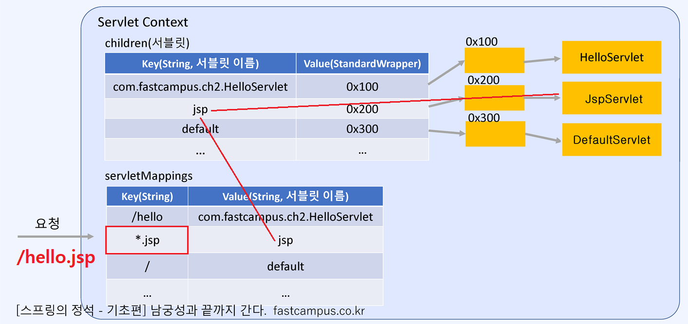 Servlet은 Servlet Context에서 서블릿을 등록하면 children Map에 저장이 되고, 또 servletMappings에 URL pattern이 어떤 servlet하고 연결될지를 관리한다. servlet은 이 2개의 Map으로 mapping을 관리하고, spring은 DispatcherServlet을 사용해서 내부에 2개의 Map과 유사한 것을 갖고서 mapping을 관리한다.