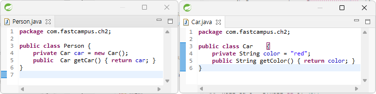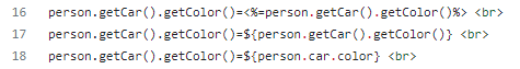 세 문장이 같은 결과를 가져온다. person.car.color를 썻다고 해서 getCar를 안가져오지 않는다. 표현만 이렇게 쓰고, pserson 객체에 getCar가 있어야 한다.