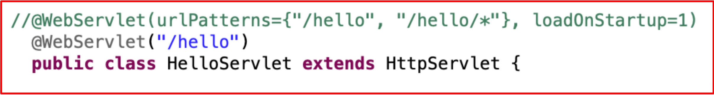 @WebServlet에 URL 패턴을 등록하고, 배열로 여러개 등록할 수 있다. servlet은 lazy init이 기본이다. 늦은 초기화를 쓴다. 하지만 loadOnStartup를 사용하면 servlet을 호출하기도 전에 미리 만든다. 뒤에 붙는 숫자는 초기화 하는 우선순위이고 겹쳐도 상관 없다.