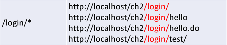 servlet의 패턴 종류가 4가지가 있고 숫자는 우선순위이다. exact mapping은 정확히 일치해야 한다. 주소창에 입력한 URL이 패턴과 정확히 일치해야한다. 배열로 URL을 여러개 등록했을 때 exact mapping이 당연히 우선순위가 높다. 만약 /login/hello.do를 입력했는데 이와 일치하는 패턴이 없으면 우선 순위가 2인 path mapping으로 넘어간다. path mapping은 경로 mapping이고 wildcard(*)를 사용한다. '/login/*'은 login 경로로 들어오면 이 패턴으로 등록되어 있는 servlet이 실행된다.