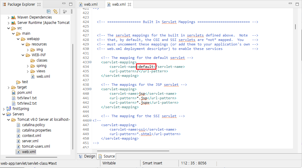 Server에 있는 web.xml은 전체설정이고, 프로젝트의 web.xml은 개별설정이다. 톰캣이 실행되면 우선 전체 설정을 적용하고 중복되는 부분은 개별 설정으로 덮는다.