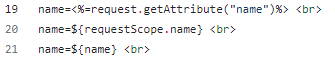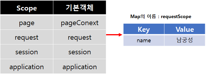 scope에는 4종류가 있고, 위 코드로 객체를 그려보면 위 그림과 같다. Map의 이름이 requestScope이고 이 Map을 호출하기 위해서는 원래 ${requestScope.name}으로 써줘야한다. 저장소의 Map이름을 찍어줘야 하지만, 생략하고 ${name}을 써도 된다. 그 이유는 Scope이 없으면 page순으로 application까지 data를 찾는다. page가 가장 좁은 범위이고 application이 가장 넓은 범위이다. 아무튼 Scope을 생략하고 바로 Key를 쓰면 알아서 scope를 뒤져서 찾아준다.