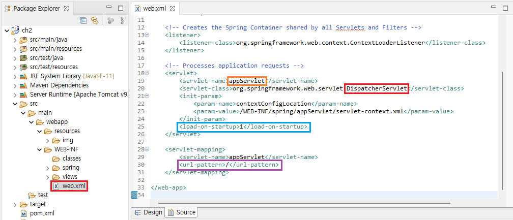 web.xml에 DispatcherServlet이 appServlet 이름으로 등록되어 있다. load-on-startup은 호출되었을 때 생성되는 것이 아니라 미리 생성되는 것이다. url-pattern은 '/'로 되어 있는데 모든 요청을 받는 pattern으로 우선순위가 낮다. 다른 pattern에게 우선순위가 밀리지만 matching되는 pattern이 없으면 default로 요청을 받는다. 따라서 spring은 서버로 오는 요청은 무조건 DispatcherServlet으로 받게 되어있다.
