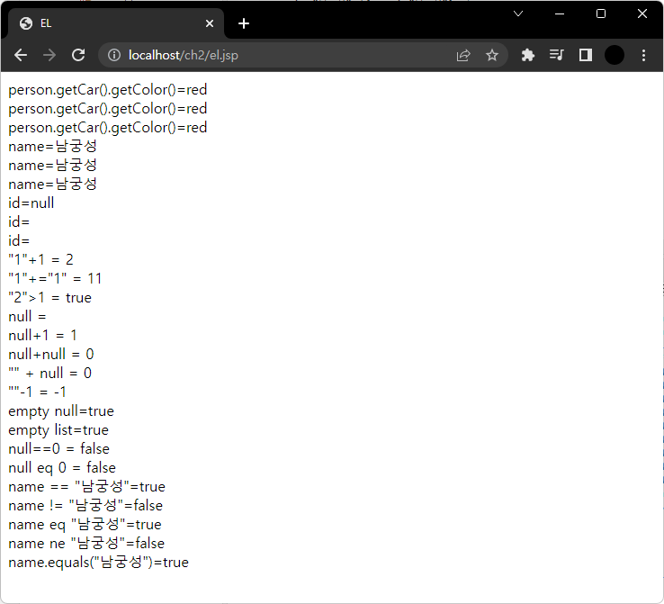 위 코드의 결과인데 jsp 코드는 null을 출력하지만 EL는 null을 출력하지 않는다.