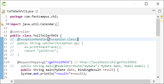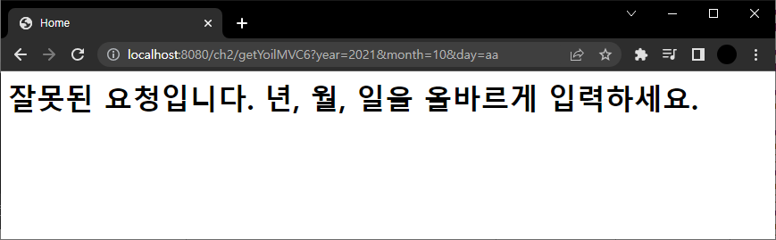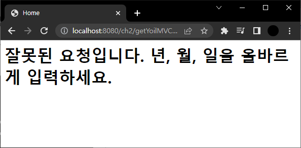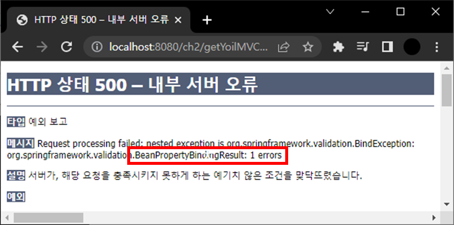 Controller를 위와 같이 BindingResult를 쓰고 url의 day값에 올바르지 않는 값을 준다. 예외 처리 때문에 yoilError.jsp가 호출되어 예외 처리문을 주석 처리하고 다시 실행한다.