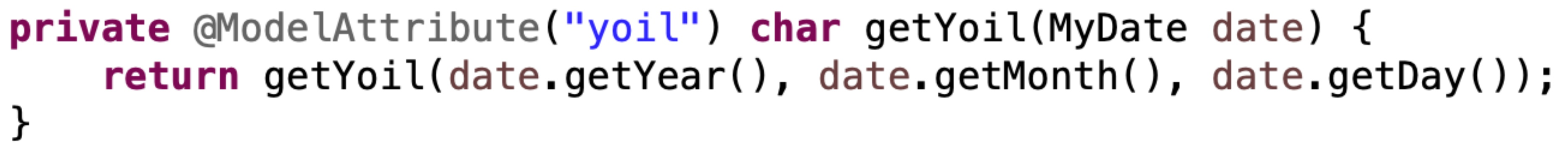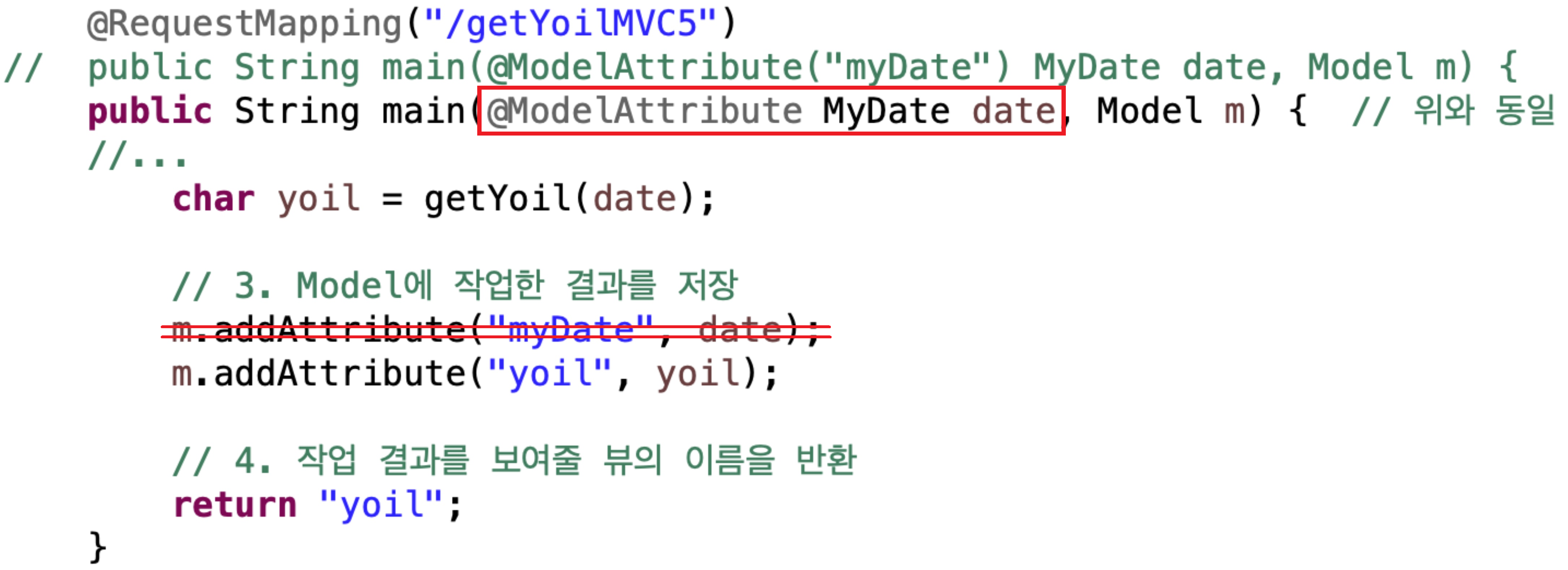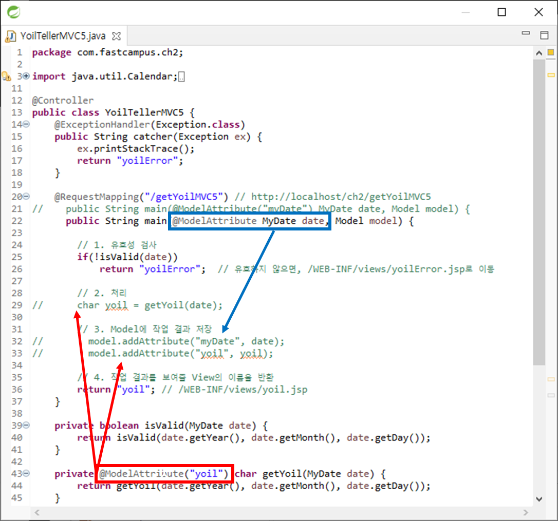 반환 타입에도 ModelAttribute 어노테이션 사용 할 수 있다. getYoil 메서드의 호출 결과를 Model에 자동으로 담는다. "yoil"이 key 값이다. getYoil 메서드의 결과가 '수'이면 "yoil"인 key에 value로 '수'가 저장된다. 따라서 main 메서드에서 yoil을 호출하고 저장하는 코드를 제거할 수 있다. Spring 내부에서 Controller에 붙은 @ModelAttribute 부분을 전부 호출해서 Model에 저장한다. 따라서 호출, 저장하는 코드를 쓸 필요가 없다.