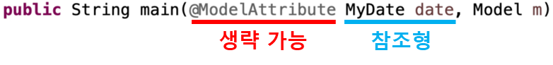 mian 메서드의 매개변수에 @ModelAttribute MyDate date를 적으면 m.addAttribute("myDate", date);를 적지 않아도 된다. 자동으로 Model 객체에 key, value인 map 형태로 key값인 "myDate"에 value로 date의 주소가 들어간다. @ModelAttribute("myDate") MyDate date에 key값을 적지 않으면 변수 타입의 첫 글자를 소문자로 바꿔서 key로 사용한다. 즉 @ModelAttribute MyDate date에서 Mydate의 첫 글자를 소문자로 바꾼 myDate를 key로 사용한다.