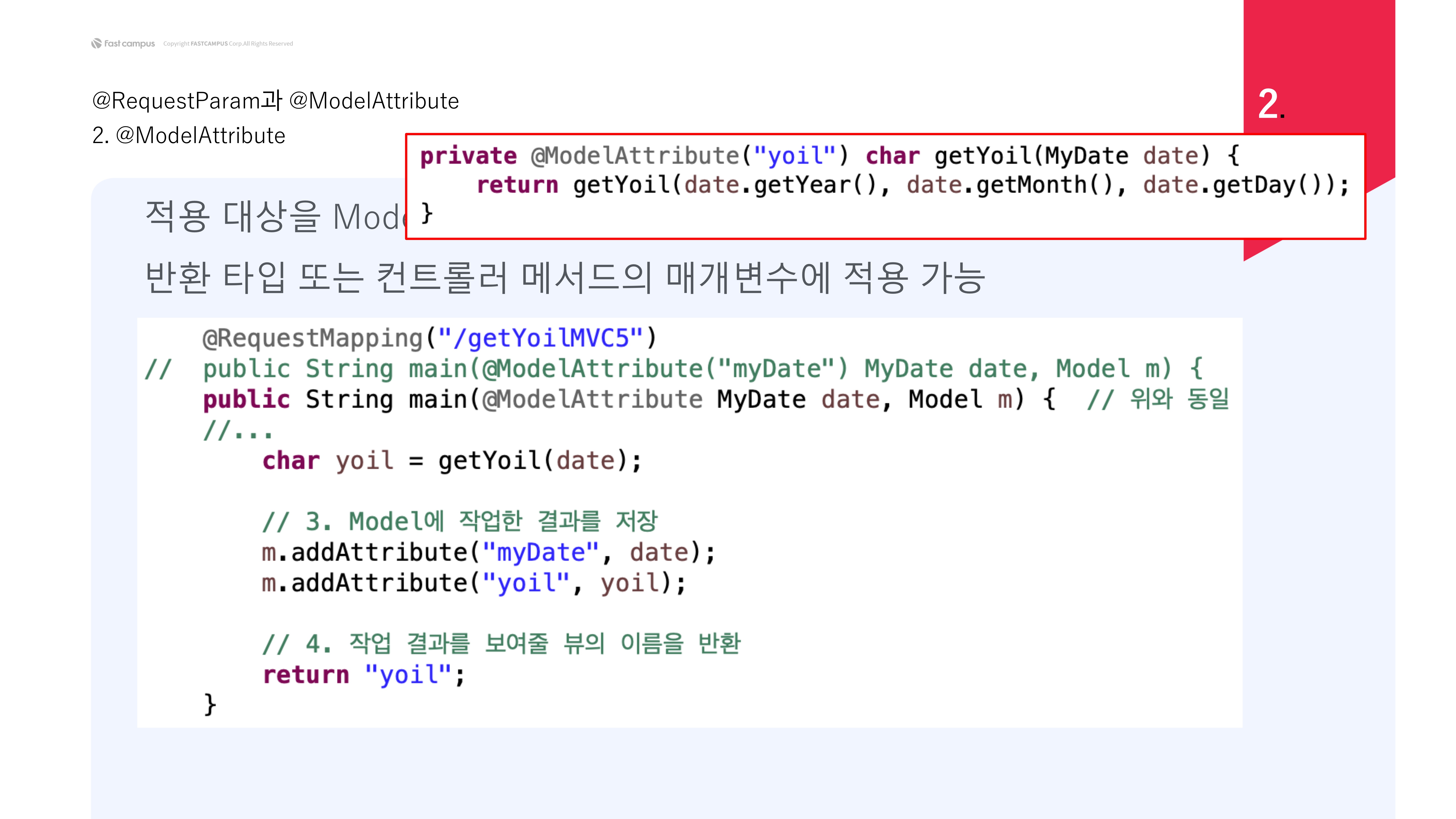 반환 타입에 ModelAttribute 어노테이션을 사용할 때는 key 값을 반드시 입력해야 한다. ModelAttribute 어노테이션을 이용하면 2. 처리, 3. Model에 작업 결과 저장 코드를 쓰지 않아도 된다.