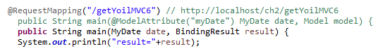 BindingResult result는 Binding할 객체인 My date바로 뒤에 와야한다. DataBinder는 브라우저의 요청을 받아올 때 중간 역할인 타입 변환, 데이터 검증을 하고 결과와 에러를 BindingResult에 저장한다.