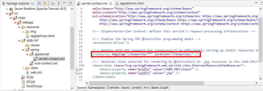 servlet-context파일에서 mapping에 있는 "/resources"를 지운다.