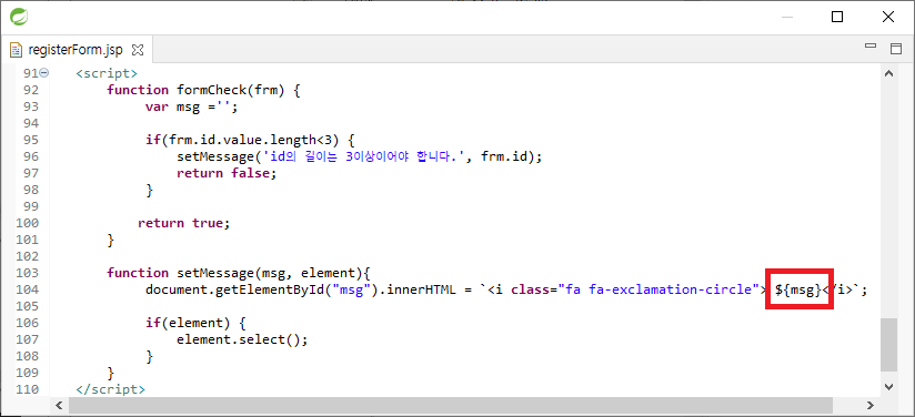 ${msg}가 EL이 아니라 JS6에서 나온 Template literal이다. EL과 비슷하게 생겼는데 EL은 서버에서 사용되고 Template literal은 브라우저에서 사용된다. 서버가 우선순위가 높아 EL로 사용되어 요청받은 msg가 없기 때문에 빈 문자열이 들어간다.